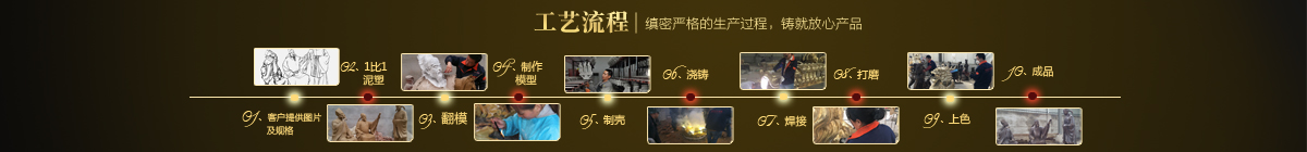 制作一件完美的鑄銅雕塑,最重要的步驟就是制作泥塑模型,然后再用工業(yè)硅膠拓印、翻模。所以泥塑的姿態(tài)、神情生動與否直接影響最終銅雕塑的品質(zhì)。所以我廠一直對泥塑模型的制作格外重視。我廠以雕塑為本,以藝術(shù)為根,挾中華文化之傳統(tǒng),偕歐陸藝術(shù)之風韻,風格獨特,盡顯淋漓盡致。我們本著大膽創(chuàng)新、勇于突破的精神,以追求卓越為導向,堅持寧缺勿濫為原則,并可依照您提供的要求,為您量身設計制作。我廠人才濟濟,有智慧嚴謹?shù)墓芾戆嘧樱姸嗄贻p充滿激情、充滿創(chuàng)意的專業(yè)設計團隊、有專業(yè)技術(shù)精湛的雕塑制作人才和專業(yè)的施工隊伍。他們不僅具深厚的文化藝術(shù)底蘊,更汲取當代雕塑精華,博采眾家之長,作品既有嚴肅莊重寫實題材,也有輕松前衛(wèi)的抽象題材,表現(xiàn)手法上浪漫主義中不乏樸實,現(xiàn)實主義中蘊涵著激情,設計理念貫穿古今、融匯中西,深刻詮釋著藝術(shù)的精髓,把古典主義和后現(xiàn)代主義完美的融合,將雕塑藝術(shù)演繹為力的凝聚、美的體現(xiàn),讓人們感受到的不僅是一種藝術(shù)的浪漫與優(yōu)雅、粗獷與悲壯、更是豐富的優(yōu)秀藝術(shù)寶藏和文化傳統(tǒng),讓您在藝術(shù)與文化中穿流,在時空中飄蕩,使靈魂在藝術(shù)的海洋洗禮。 MORE+